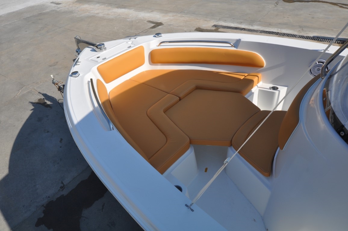 5-star ultra-violet additive Marine Enma white Gel code, steering console, cabinet in the console, folding cabinet door, door stopper, chrome console rail, plexy glass window, double Captain’s seat, mobile double-sided back rest, store under the seat, wide store under the back seat, UV additive import Marine furniture group resistant to sun light and salty water, prow cabinet, cabinet doors (complete with hinges), 2 pieces plastic handles, dual outlet Flash drain system (the system draining the water accumulated in the deck to the sea notwithstanding the bilge), 2 pieces glass holders, 3 pieces chrome U beckets, 4 pieces chrome deck cleat, navigation lights, chrome stairs with platform (folding type 3-step), aluminum side molding, three-layer hull structure, polyester keel system, white hull color, hull stickers, bilge pump, fuse panel, battery holder, bilge vent, small tube, prow drum, anchor holder, electrical wiring, horn, 120 l base fuel tank, fuel float and indicator, indicator panel, chain water discharge, tank ventilation, chrome fuel filling inlet, chrome deck rail, 1 piece intervention cover, non-slip wet floor structure